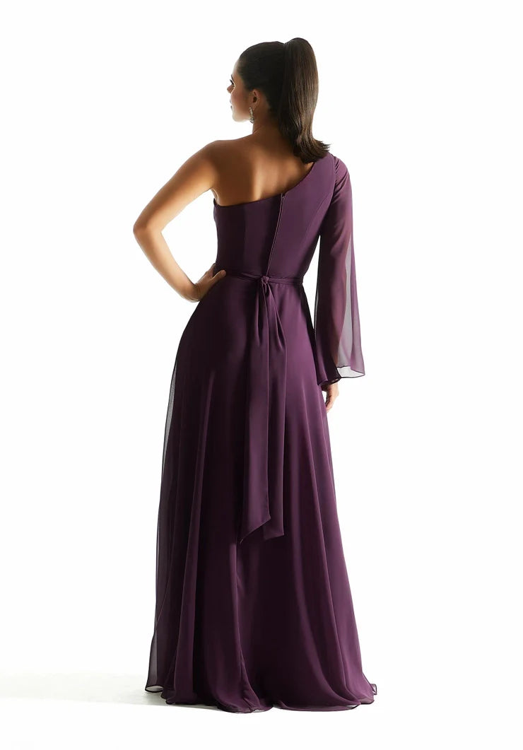A-line one shoulder neckline snow-white transparent long sleeved bridesmaid dress