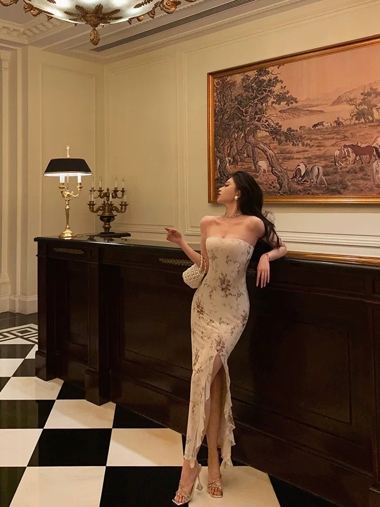 Classy Sheath Strapless Floral Ivory Long Prom Dresses Birthday Outfits Evening Gown SD1001