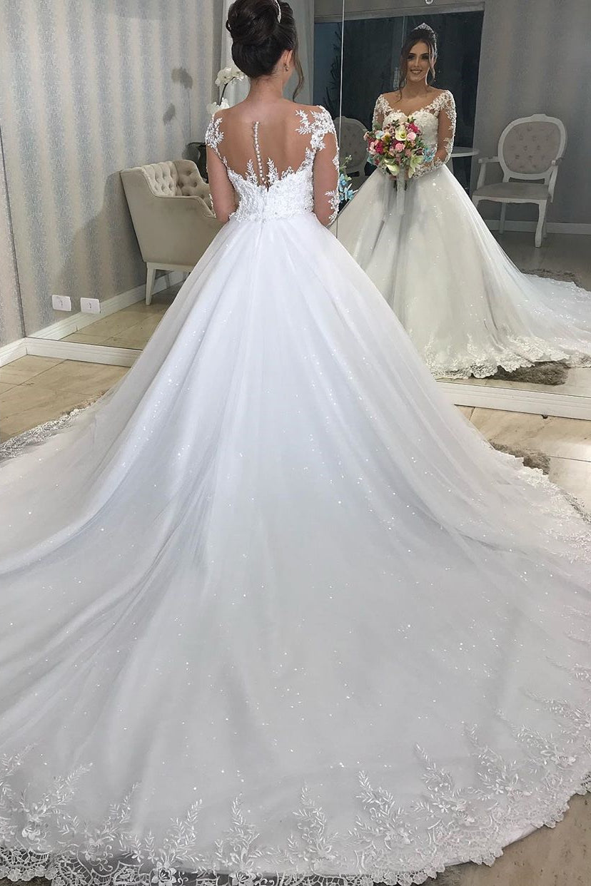 Princess long a-line white wedding dress with v neckline, lace appliques and long sleeves.