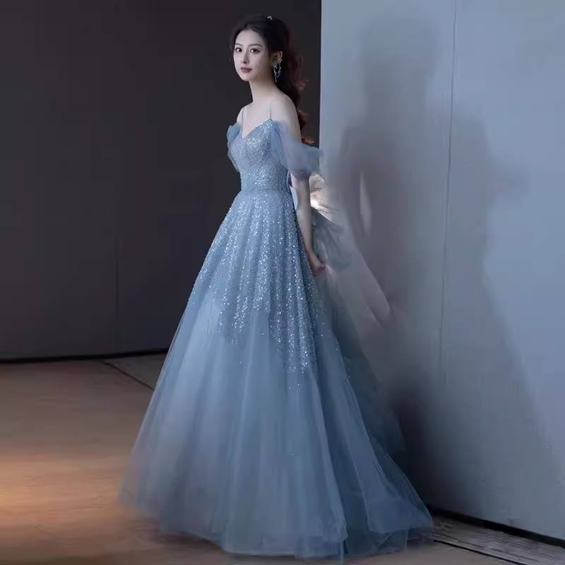 Blue A line tulle sequin long prom dress, blue tulle evening dress - picture color